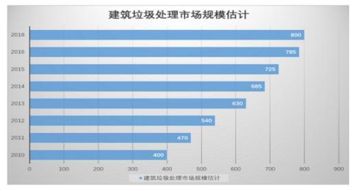 2017年我國建筑垃圾處理市場的體量已經(jīng)超過800億元,相較于2010年400億元,翻了一番,8年內(nèi)的平均增長率超過10%。中國環(huán)保在線判斷,維持現(xiàn)有的增長率,到2020年,我國建筑垃圾處理市場規(guī)模可以輕松突破1000億大關(guān)。還有機構(gòu)預(yù)測,到2030年,我國建筑垃圾能夠帶來的產(chǎn)值將超過3300億元。