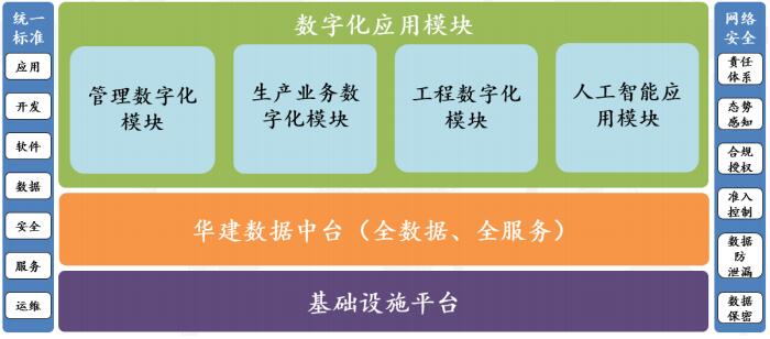 項目建設內(nèi)容 本項目的建設內(nèi)容包括基礎設施底層平臺、智能化數(shù)據(jù)中臺以及管理數(shù)字化、 生產(chǎn)業(yè)務數(shù)字化、工程數(shù)字化、人工智能應用四大應用模塊,具體建設架構如下 圖所示: