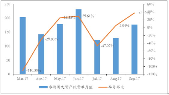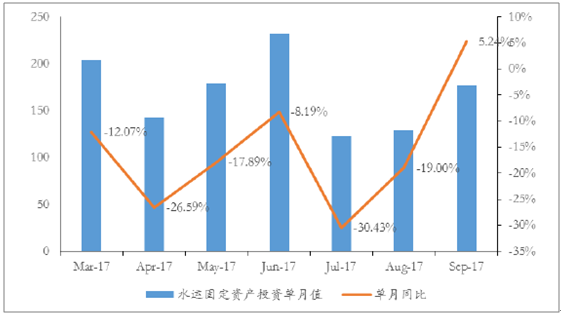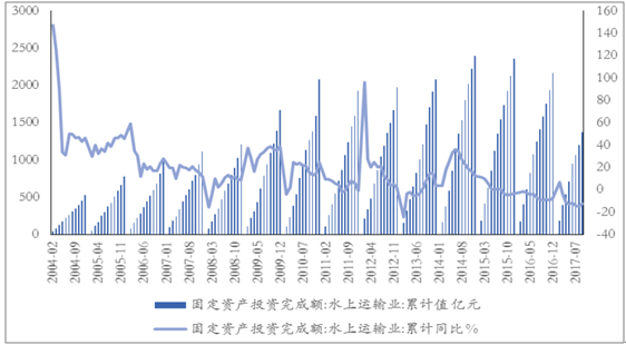 水上運輸業(yè)固定資產(chǎn)投資整體呈現(xiàn)波動下行趨勢,2017年7月以來單月環(huán)比/同比數(shù)據(jù)改善:從國家統(tǒng)計局數(shù)據(jù)來看,我國水上運輸業(yè)固定資產(chǎn)投資累計值同比增速由2004年2月的高點146.7%,波動下滑至2013年2月的低點-24.6%,整體呈現(xiàn)波動下行趨勢。從2017年單月數(shù)據(jù)來看,自7月以來水上運輸業(yè)固定資產(chǎn)投資增速有所恢復(fù),已由7月單月同比下滑30.43%回升至9月單月同比增長5.24%;7月單月環(huán)比下滑47.07%回升至9月單月環(huán)比上升37.19%,整體改善幅度較大。