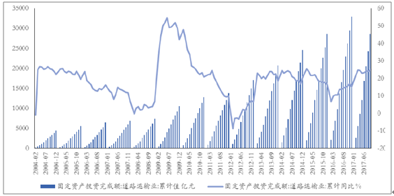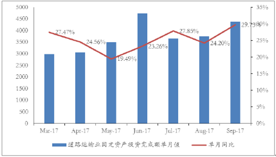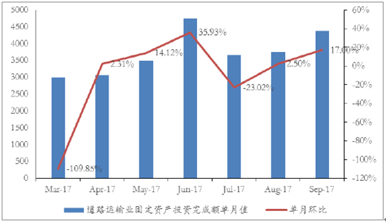 道路運輸業(yè)投資增速自2012年2月至今呈波動上升趨勢:從國家統(tǒng)計局歷年公布數(shù)據(jù)來看,我國道路運輸業(yè)固定資產(chǎn)投資自2004-2012年間增幅波動較大,2006年9月達到最高值54.7%,2012年2月回落至最低點-8.69%。2012年2月至今,我國道路運輸業(yè)固定資產(chǎn)投資增速已由當時低點-8.69%,回升至2017年9月的24.9%,整體呈現(xiàn)波動上升趨勢。同時2017年9月單月道路運輸業(yè)固定資產(chǎn)投資額為4382.26億元,較2016年9月同比增長29.73%,為2012年12月以來最高點;較2017年8月環(huán)比增長17%,預(yù)計全年道路運輸業(yè)固定資產(chǎn)投資額將保持波動上升趨勢。
