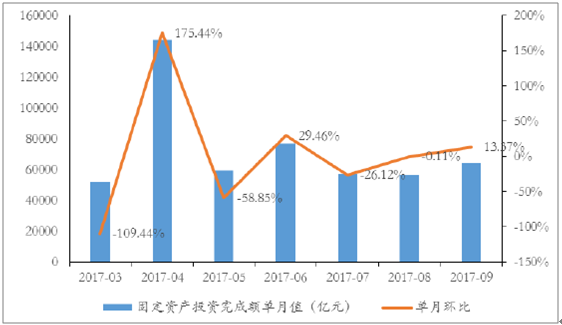 2017年單月固定資產(chǎn)投資金額及環(huán)比(億元;%)