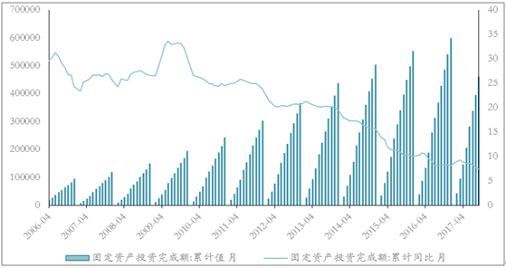 固定資產(chǎn)投資增速整體回落:從2006年以來國家統(tǒng)計局固定資產(chǎn)投資數(shù)據(jù)來看,我國固定資產(chǎn)投資累計同比增速自2017年上半年以來呈現(xiàn)下行趨勢,2017年1-9月全國累計固定資產(chǎn)投資(不含農(nóng)戶)完成額45.84萬億元,同比增長7.5%,低于1-8月份7.8%的同比增長率,為2017年以來最低值,我國固定資產(chǎn)投資整體增速呈現(xiàn)下行趨勢。