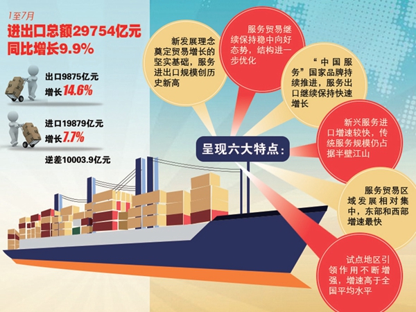 1—7月,我國(guó)服務(wù)進(jìn)出口保持較快增長(zhǎng)。進(jìn)出口總額29754億元(人民幣,下同),同比增長(zhǎng)9.9%。其中,出口9875億元,增長(zhǎng)14.6%;進(jìn)口19879億元,增長(zhǎng)7.7%;逆差10003.9億元。若以美元計(jì),服務(wù)進(jìn)出口、出口和進(jìn)口增速分別為17.2%、22.3%和14.9%。...